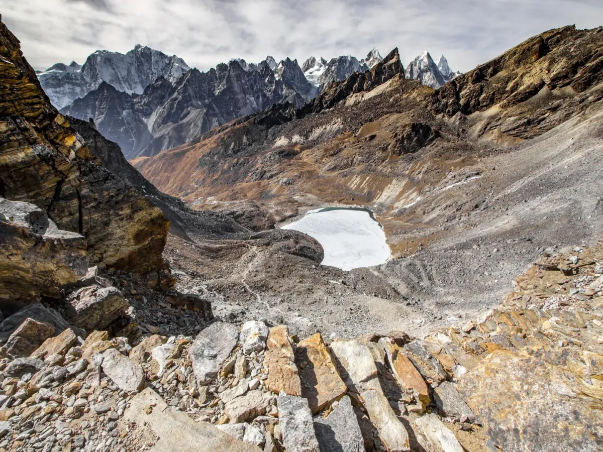 The second and most technical pass. You traverse the Ngozumpa Glacier before a steep climb to the pass. The descent is often icy and requires caution (micro-spikes recommended).